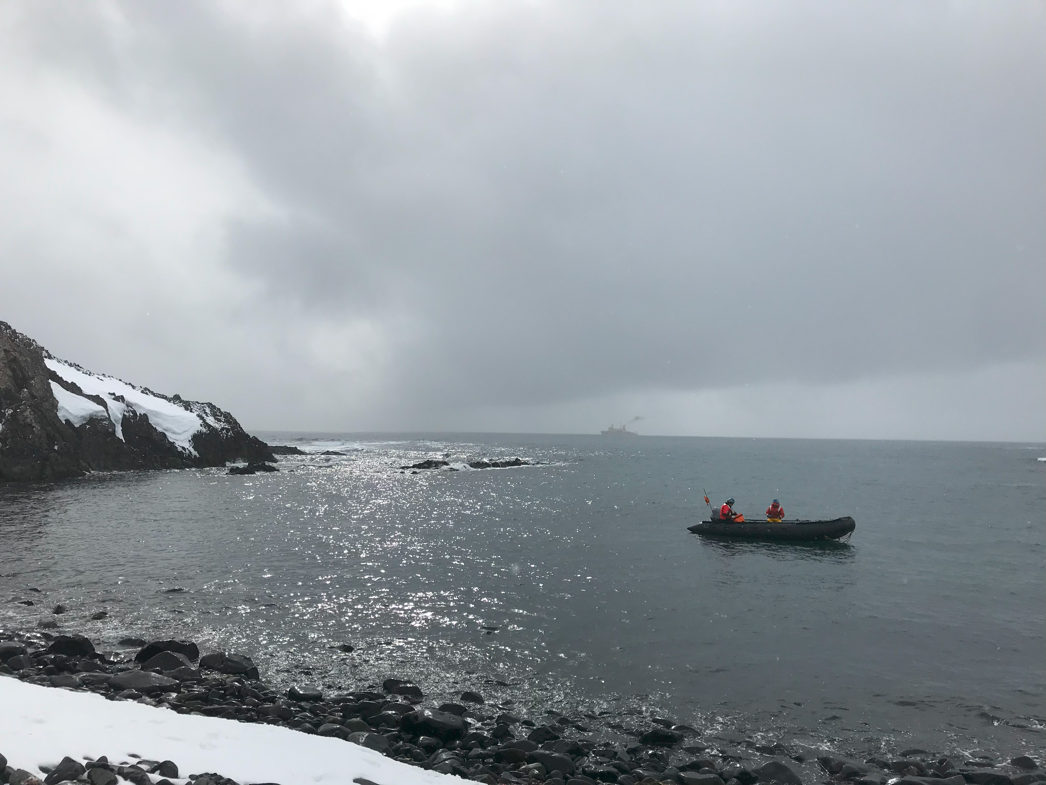 The RVIB Nathaniel B. Palmer, visible in the distance, was used to collect samples as part of the CICLOPS cruise. Here, a zodiac waits as a science crew works ashore Livingston Island as part of an earlier research effort. Image courtesy Margaret Mars Brisbin.