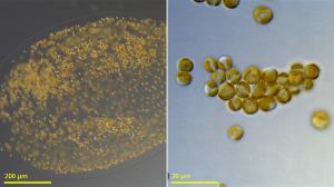 Phaeocystis is a type of microscopic ocean organism that can change its form, which plays an important role in how energy and nutrients move through marine ecosystems. Images courtesy Ian Probert (Roscoff, France).